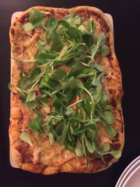 Leftover Edition: Chicken pizza Published May 14, 2016 at 2448 × 3264 Chicken Pizza topped with corn salad or Mâche