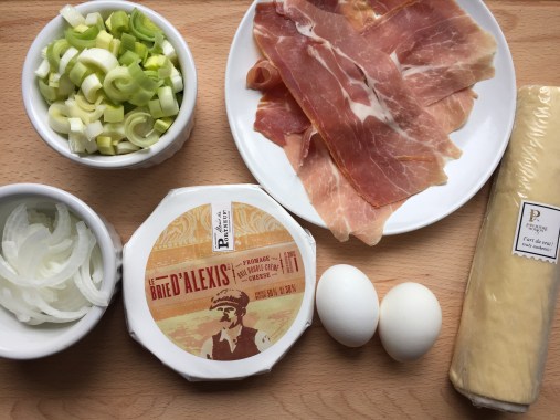 Prosciutto, leek and egg tart Published May 3, 2016 at 3264 × 2448 cut leeks, sliced onion, Brie cheese (Le Brie D’Alexis), prosciutto, eggs and sheet of puff pastry. Prosciutto, leek and egg tart